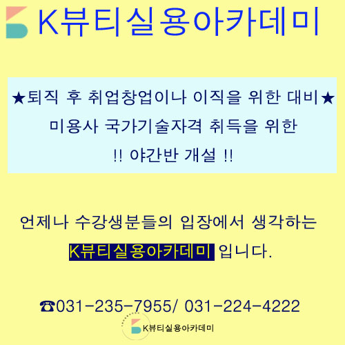 고용노동부 승인의 신뢰높은 교육기관! 저희 K뷰티실용아카데미의 야간반이 운영중입니다!